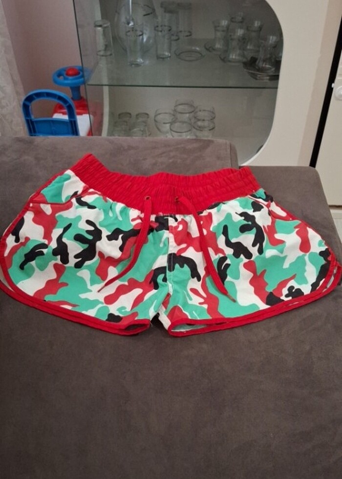 Kırmızı yeşil siyah renkleri olan mini bir şort.
