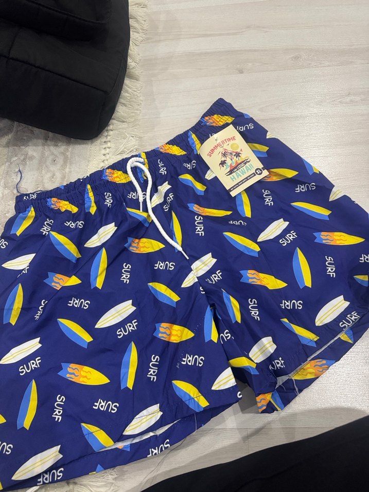 Renkli, bol kesim ve lastikli bel detaylı erkek şortu, mavi tie-dye ve sörf tahtası desenli.
