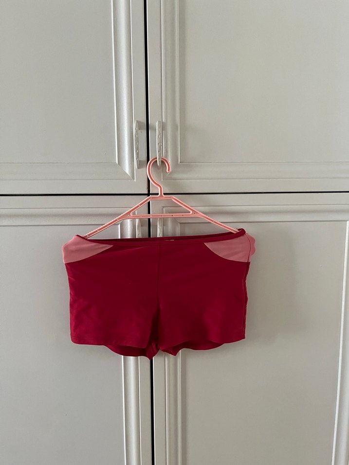 Koyu pembe renkte, elastik, deniz şortu.