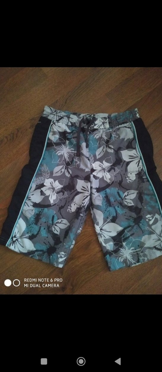 Gri renkli, bağlamalı bel ve çiçek desenli bol kesim erkek çocuk deniz şortu, sentetik kumaştan