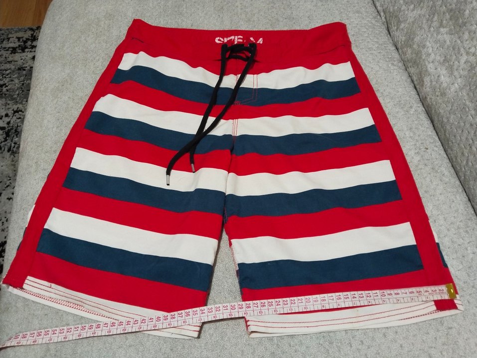 Kırmızı, beyaz ve lacivert renklerde çizgili erkek deniz şortu, ayarlanabilir bağcık detaylı.