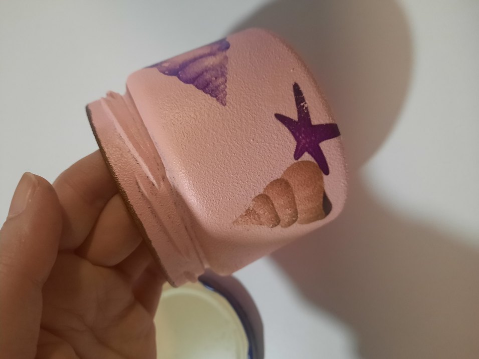 Deniz kabuğu ve denizyıldızı desenleriyle süslenmiş, yumuşak pembe dokulu cam kavanoz