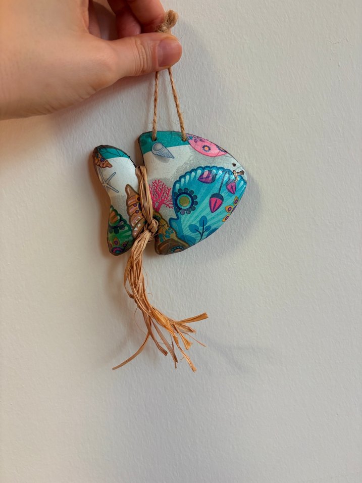 Deniz temalı desenlere ve doğal ip püsküle sahip bohem tarzda dekoratif balık süsü. Duvara asılabilir. Yaklaşık 10x10cm boyutlarında