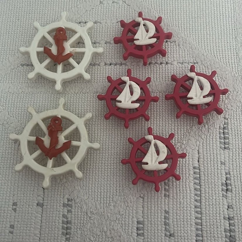 Beyaz ve gri renklerde, çapa ve yelkenli gibi deniz temalı dolap çekmece kulpları ⚓