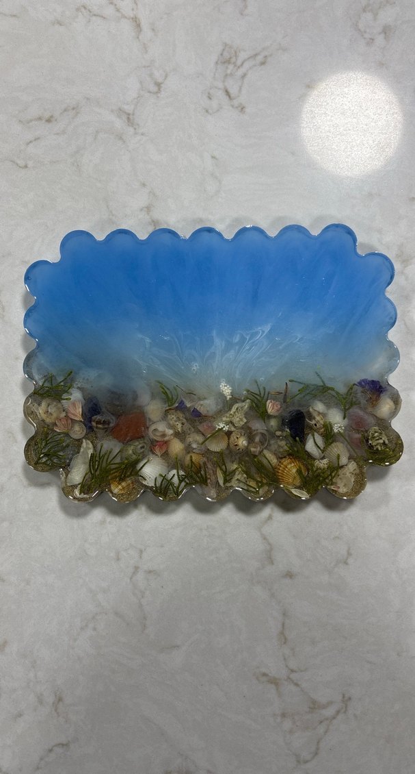 Mavi degrade renkte, içinde deniz kabukları ve küçük süs bitkileri bulunan deniz temalı epoksi sunumluk