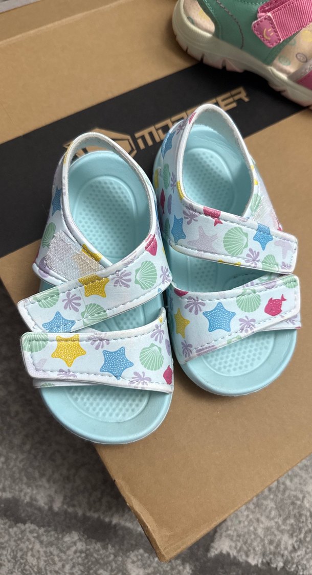 Renkli deniz temalı baskılı kız çocuk terliği, ayarlanabilir Velcro bantlarla rahat kullanım sağlar. Sokak stiline uygun. 24/25 numara