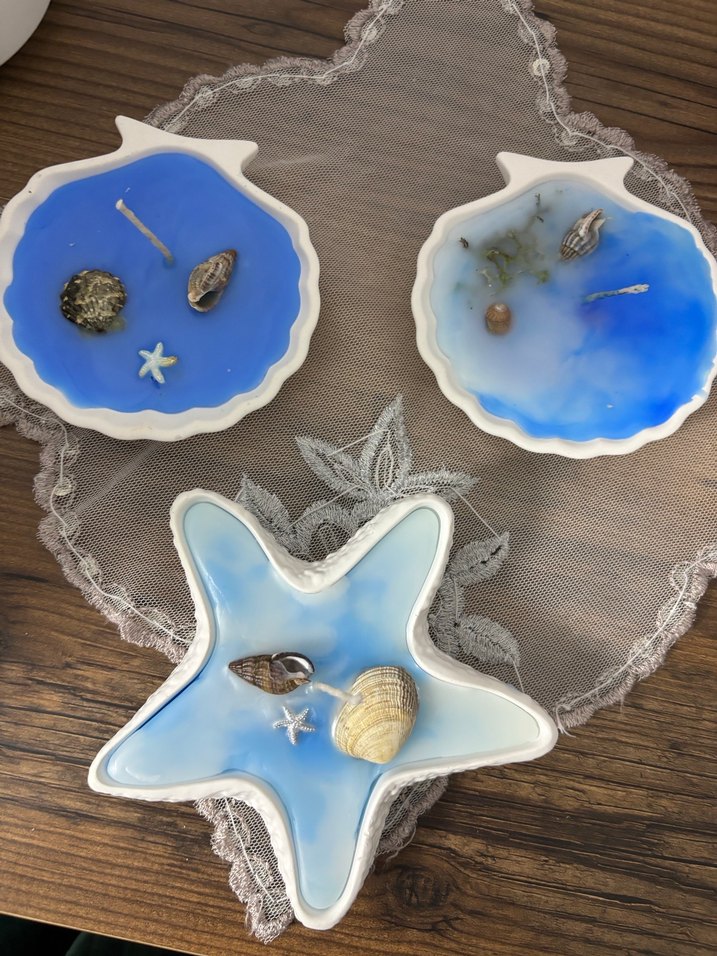 Deniz kabukları detaylı, deniz yıldızı ve deniz kabuğu şeklinde açık mavi dekoratif mumluk seti. 1 adet fiyatıdır
