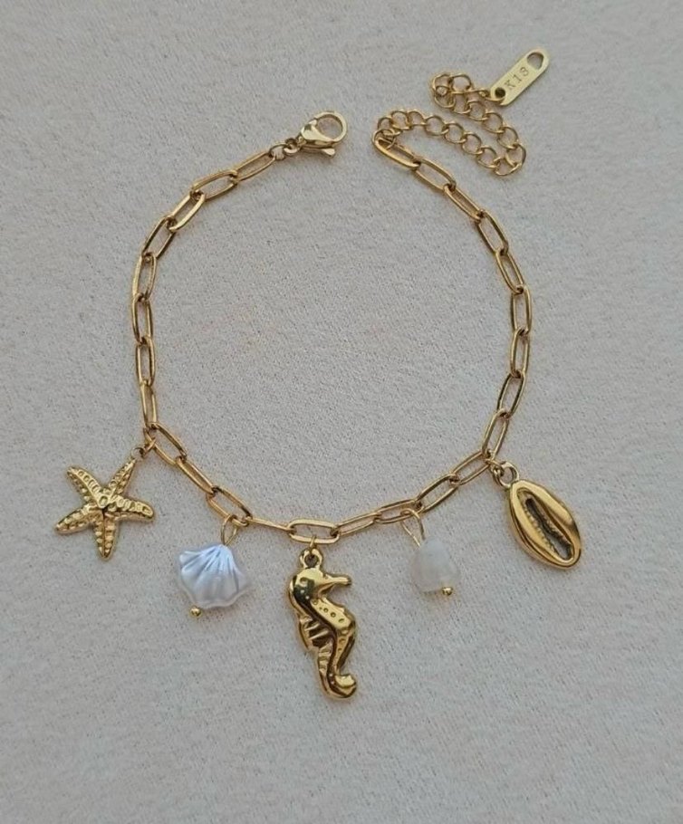 Deniz temalı deniz yıldızı, denizatı, kabuk ve inci görünümlü boncuklarla süslenmiş altın zincir detaylı bileklik.