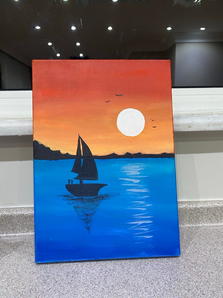 Canlı günbatımı ve beyaz güneş eşliğinde denizde yelkenli tekne ve gökyüzünde kuşların yer aldığı tablo.