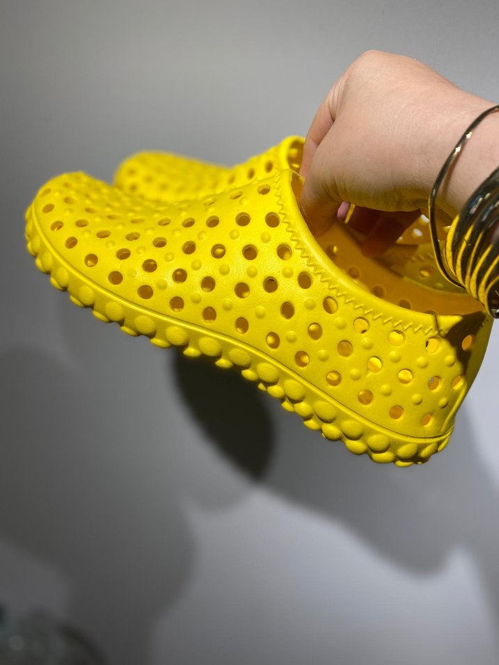 Sarı kauçuk malzemeden yapılmış, puantiyeli desene ve cırt cırtlı kapanışa sahip erkek su ayakkabısı. Renkli ve şık tasarım, günlük kullanım için uygun.