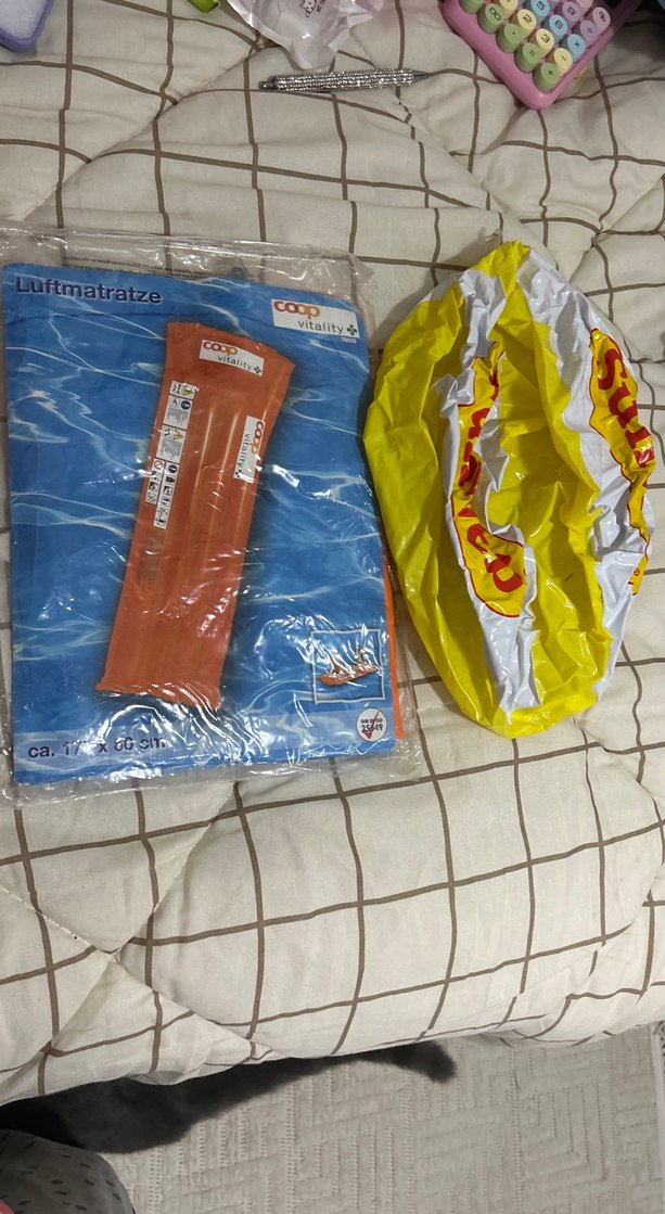 Coop Vitality markalı sarı ve gri çocuklar için şişme deniz minderi, hafif ve taşınabilir. Havuz ve plajda kullanıma uygun.sıfırlar.