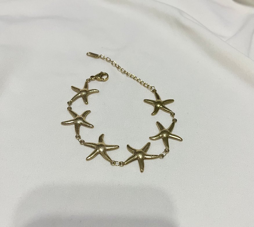 ✨Tüm ürünlerimiz kararma, solma ve paslanmaya karşı garantilidir Altın renginde, zincir detaylı ve deniz yıldızı figürlü bileklik. Parlak yüzeye sahip, minimal, bohem ve retro tarzlara uygun, günlük kullanım için ideal.