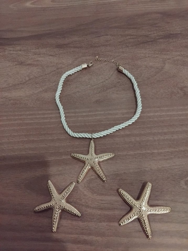 Beyaz deniz yıldızı detaylarıyla bohem ve minimal bir tarz sunar. Küpe ve kolye set halindedir ve çok şık bir duruşu var kullanılmadı
