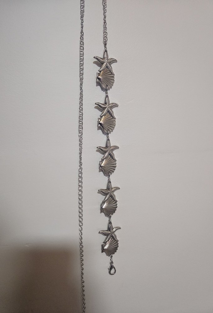 Deniz yıldızı ve deniz kabuğu detaylı, gümüş bohem tarzda zincir bel kemeri.
