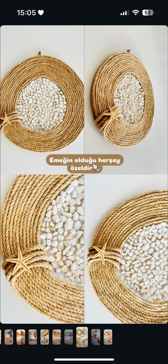 Merkezi küçük beyaz taşlarla dolu, halattan yapılmış bohem tarzda duvar çerçevesi. Üzerinde deniz yıldızı süsü bulunur.