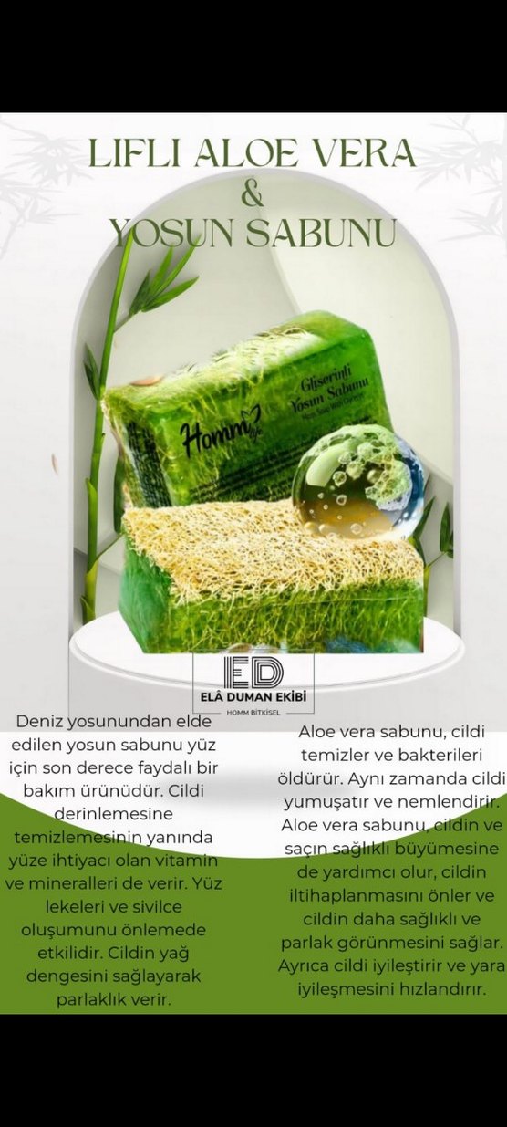 Deniz yosunundan ve aloe vera içeren sabun, cildi derinlemesine temizler, bakterileri giderir, yumuşatır ve nemlendirir. Cilt ve saç sağlığını destekler
