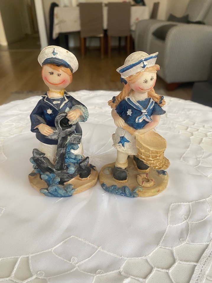 Koyu mavi renkli, denizci temalı iki figürin seti. Biri çapa tutarken diğeri ağ taşıyor, dekoratif taban üzerinde duruyorlar. ⚓bır tanenın boynunda tadılat var Ikısının fıyatıdır