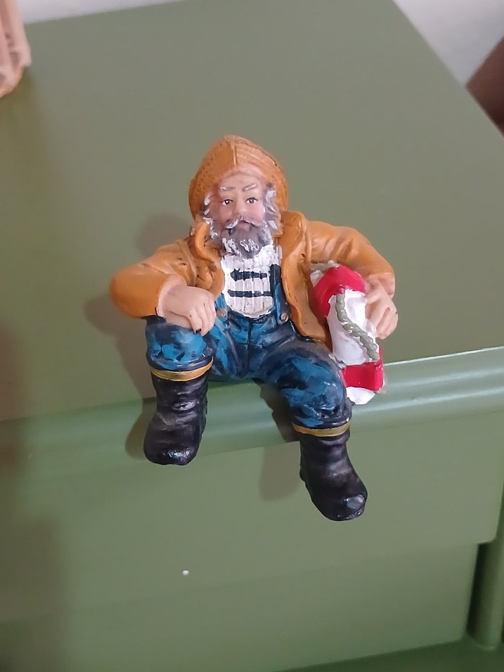 Kahverengi kapüşonlu ceket ve koyu mavi pantolon giymiş oturur pozisyonda figürin. Kırmızı beyaz bir nesne tutuyor, detaylı sakalı ve siyah botları var. tertemiz sorunsuz