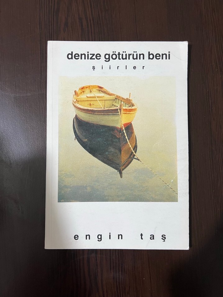 Engin Taş'ın 'Denize Götürün Beni' adlı şiir kitabı, sakin sularda yüzen bir tekne kapağıyla birlikte şiirler içerir.