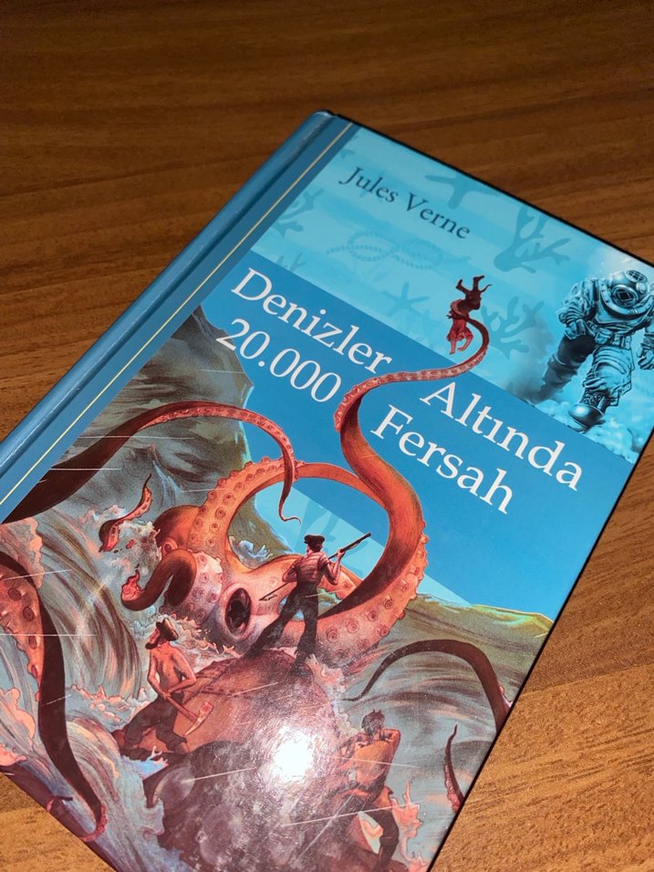 Jules Verne'in 'Denizler Altında 20.000 Fersah' adlı romanı, deniz altı macerasını konu alır. Kapakta dev bir ahtapot ve dalgıçlar yer alır.