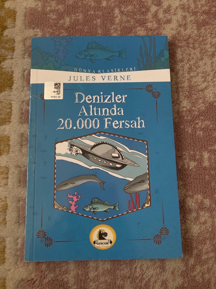 Jules Verne'in "Denizler Altında 20.000 Fersah" adlı klasik macera kitabı, kapakta denizaltı keşfi ve deniz canlıları resimleri ile dikkat çekiyor.