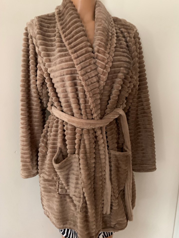 Yumuşak dokulu uzun kahverengi kadın sabahlık, bol kesim ve kuşaklıdır. Uzun kollu ve ceplidir. SIFIR KULLANILMAMIŞ beden M İÇİNDE uygundur