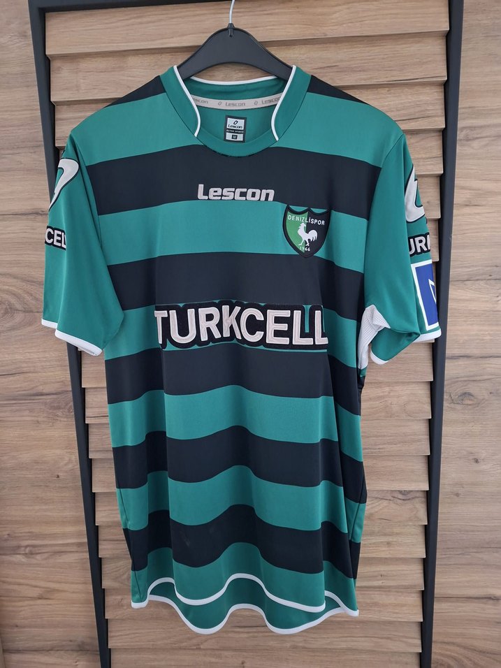 Lescon marka erkek spor tişörtü, koyu yeşil-siyah geniş çizgili, yuvarlak yakalı ve kısa kolludur. Sentetik kumaştan üretilmiş, bol kesim ve kolunda velcro detayları vardır. ♂️