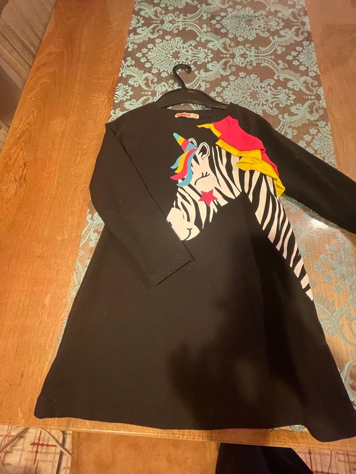 Bisiklet yakalı ve uzun kollu, pamuklu kumaştan yapılmış, bohem tarzda, zebra desenli ve renkli drapeli kız çocuk elbisesi. Çok çok az kullanıldı. 5-6 yaş için kullanıma uygun. Üç mevsim kullanılabilir.