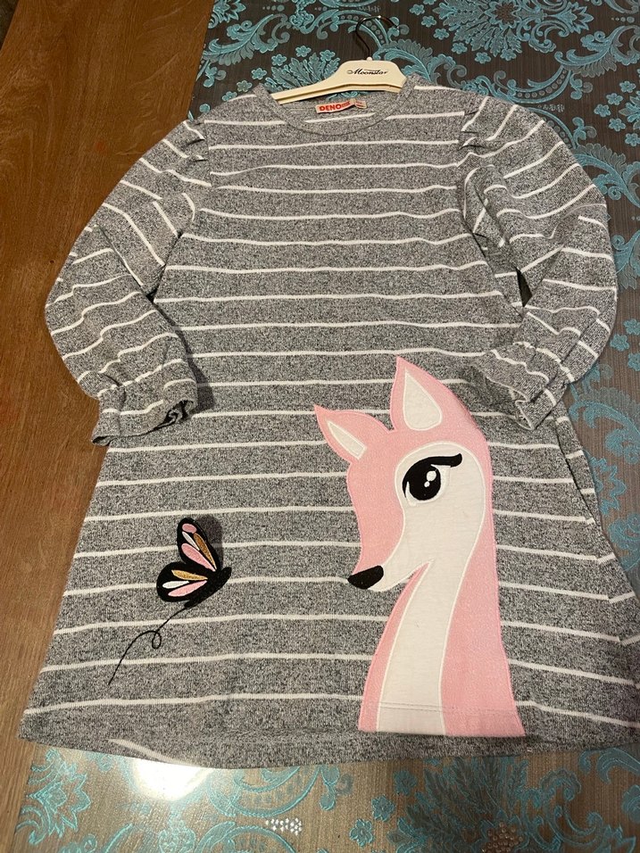 Bu uzun kollu, bisiklet yakalı gri kız elbisesi, yumuşak örgü fleece kumaştan olup, geniş kesimdedir. Üzerinde pembe geyik ve kelebek aplike bulunur. Çok çok az giyildi. 5,6 hatta 7 yaş bile kullanabilir.
