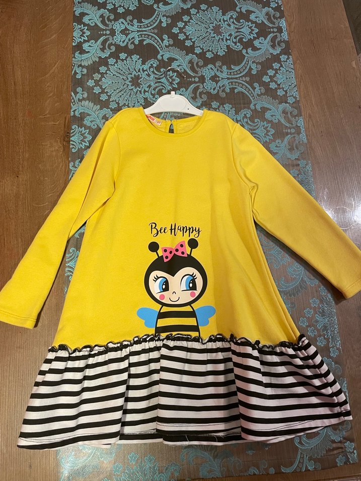 Uzun kollu, yuvarlak yakalı sarı kız elbisesi bol kesimdir. Renkli arı baskısı ve çizgili fırfırlı etek ucu vardır, yumuşak pamuklu kumaştan yapılmıştır.