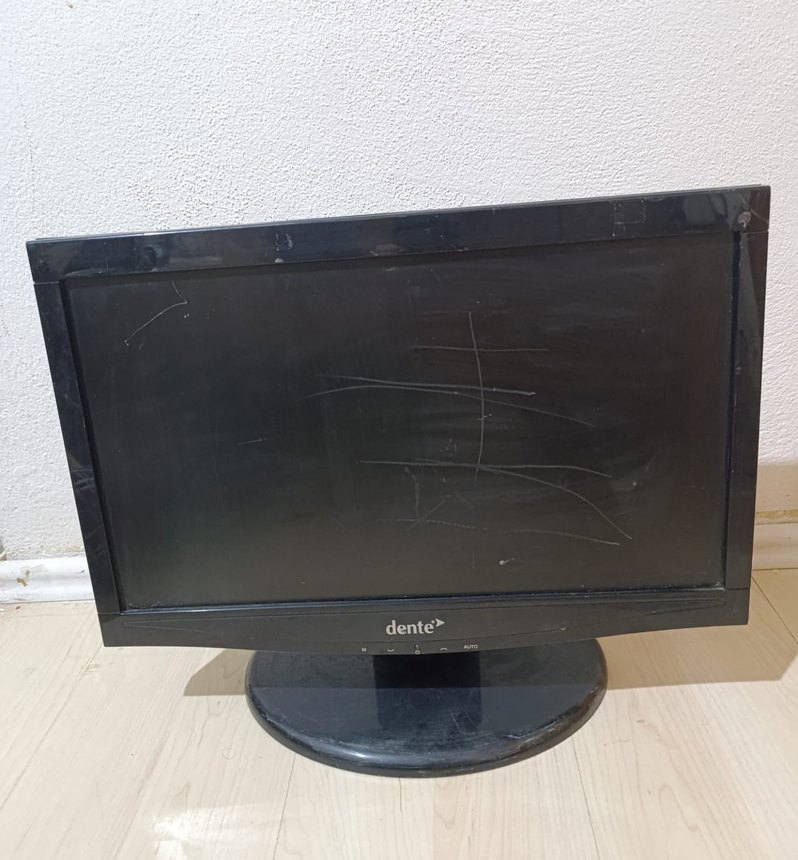 Dente monitör sorunsuz çalışıyor fakat fotoğrafta da görüldüğü gibi ekranda çizikler var. Güç girişi ve vga girişi var. İsteyene tanesi 50 tl den güç kablosu ve vga kablosu verilir.