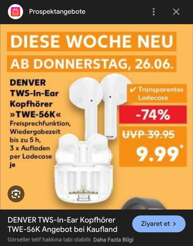 Denver TWS kulaklıklar, beyaz renkte, şeffaf şarj kutusu, eller serbest kullanım, 5 saate kadar çalma süresi ve şarj kutusuyla 3 kez şarj edilebilir. Almanya dan aldığım kulaklık. kullanılmamış. kulaklık koleksiyonum var diyebilirim. buna sıra gelmedi.