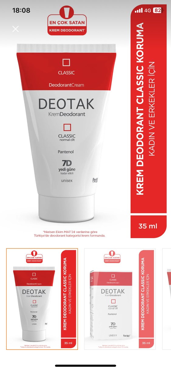 Deotak Classic krem deodorant, Pantenol içerir ve 7 güne kadar koruma sağlar. Normal ciltler için unisex kullanıma uygundur. Hiç kullanılmadı paketli