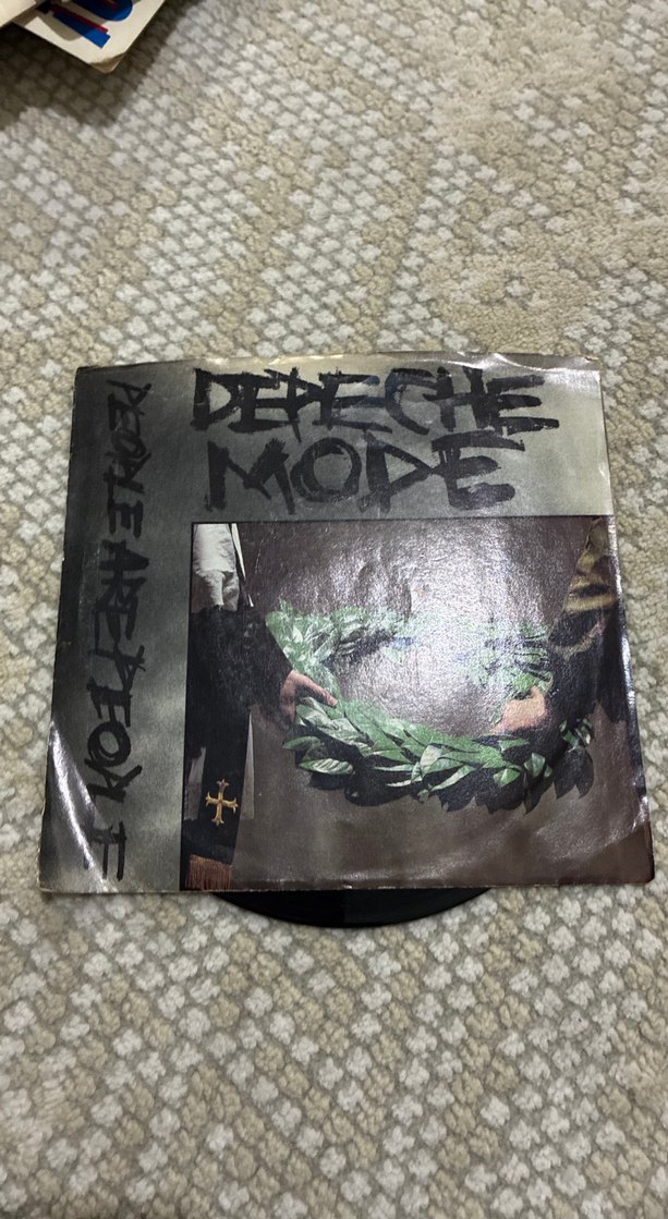 Depeche Mode'un Brave New World 45’lik, iki elin tuttuğu bir çelenk ve belirgin grup ismiyle kapak tasarımına sahip.