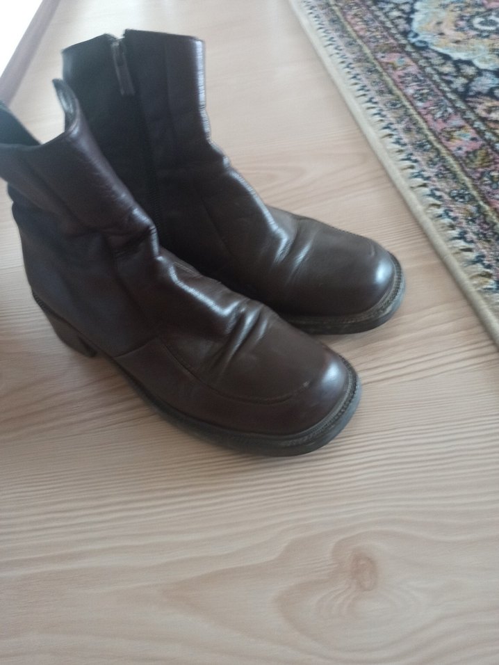 Kahverengi deri, tokalı erkek botları. Gotik tarzı ve sokak stiline uygun, günlük kullanıma uygun.