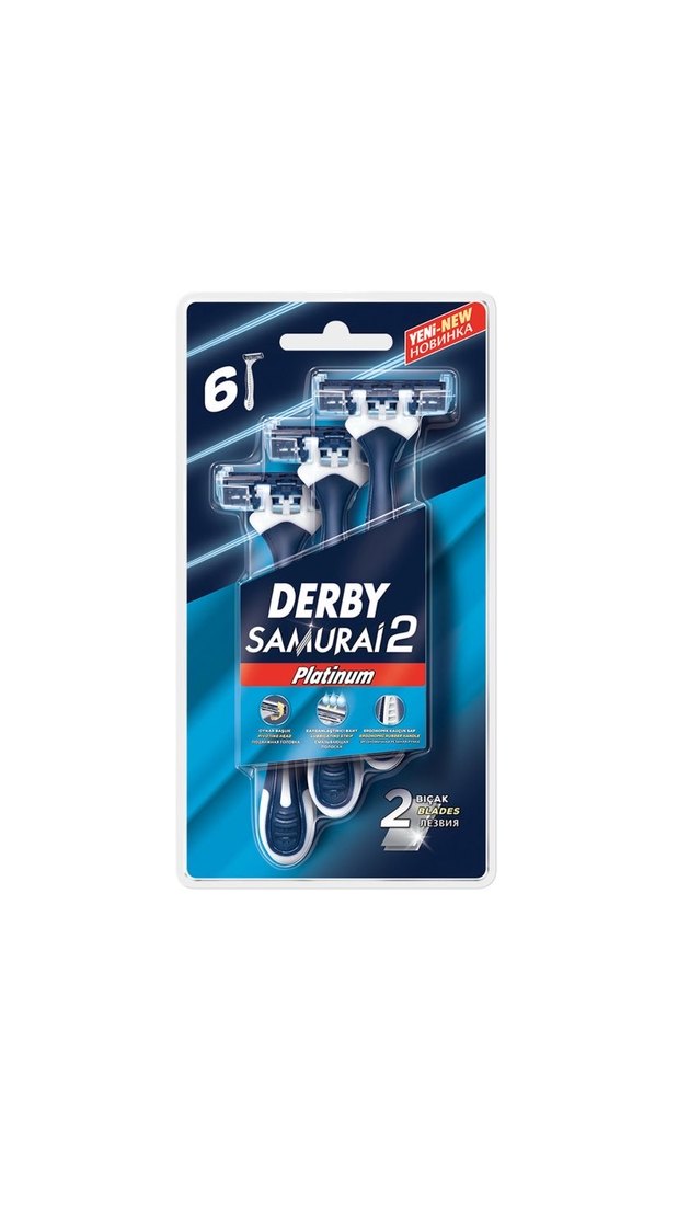 Derby Samurai 2 erkek tıraş makinesi, altı adet mavi ve gri renkte, platin kaplı bıçaklı tıraş bıçağı içerir. Her makinede iki bıçak bulunur, pürüzsüz tıraş sağlar.