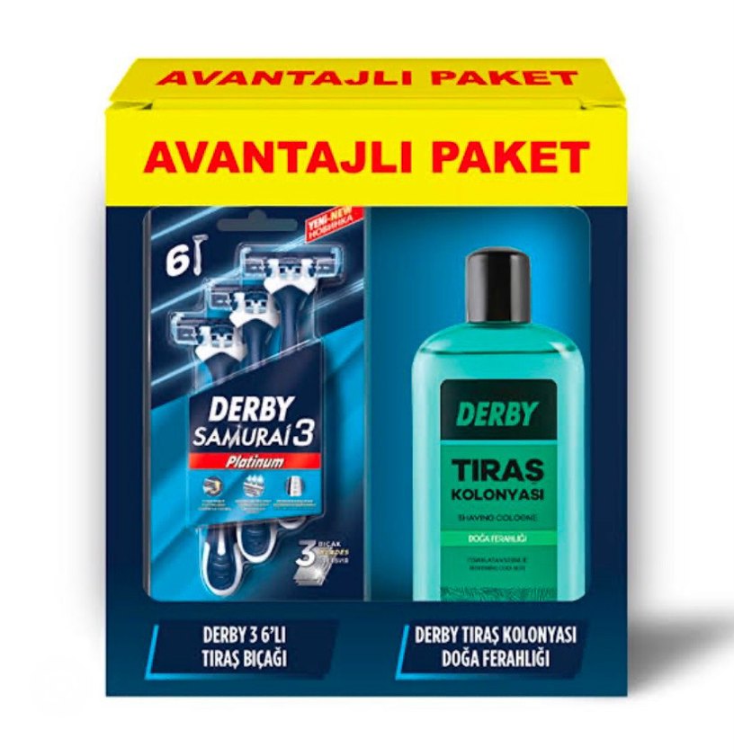 Derby marka 3 adet tıraş bıçağı ve doğal ferahlık veren tıraş kolonyası içeren set. Temiz tıraş ve ferah his için ideal.
