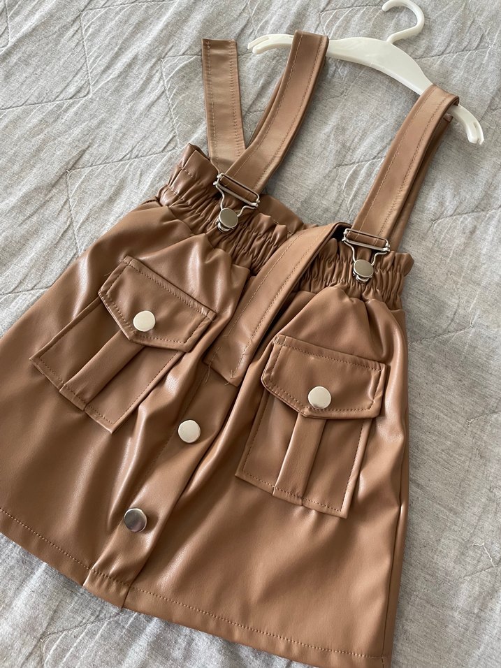 deri kumaştan yapılmış, askılı ve düğmeli ceplere sahip kız elbisesi.