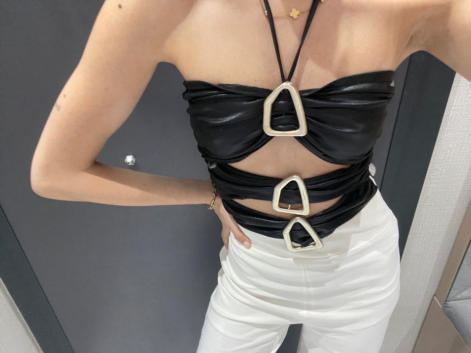 Beyaz mini deri büstiyer, askısız yakalı ve kemerli detaylı, çağdaş parti stili için uygun. ✨ Sagaza Studio Siyah Aksesuar Detaylı Body