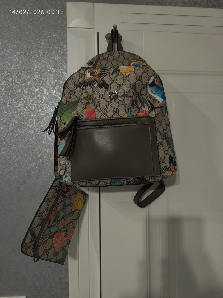 Baskılı deri ve çok renkli tasarıma sahip, tokalı ön cepli kadın sırt çantası. Sokak stiline uygun.