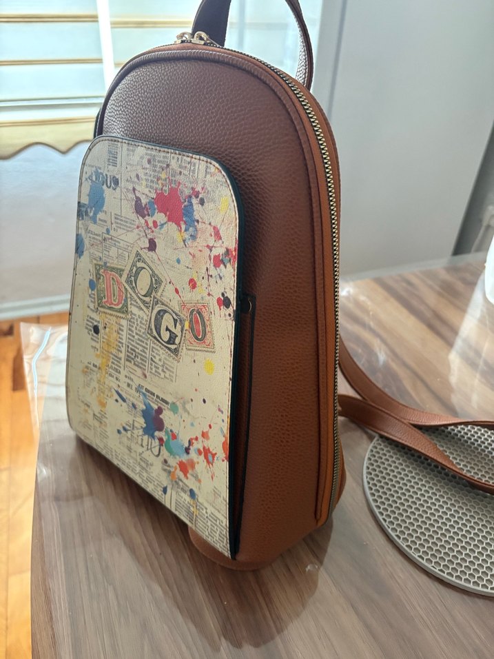 Kahverengi deri sırt çantası, baskılı renkli ön cepli ve fermuarlı, sokak stili ve günlük kullanım için uygundur. Dogo marka eşim hediye almış ama hiç bana höre değil satıyorum