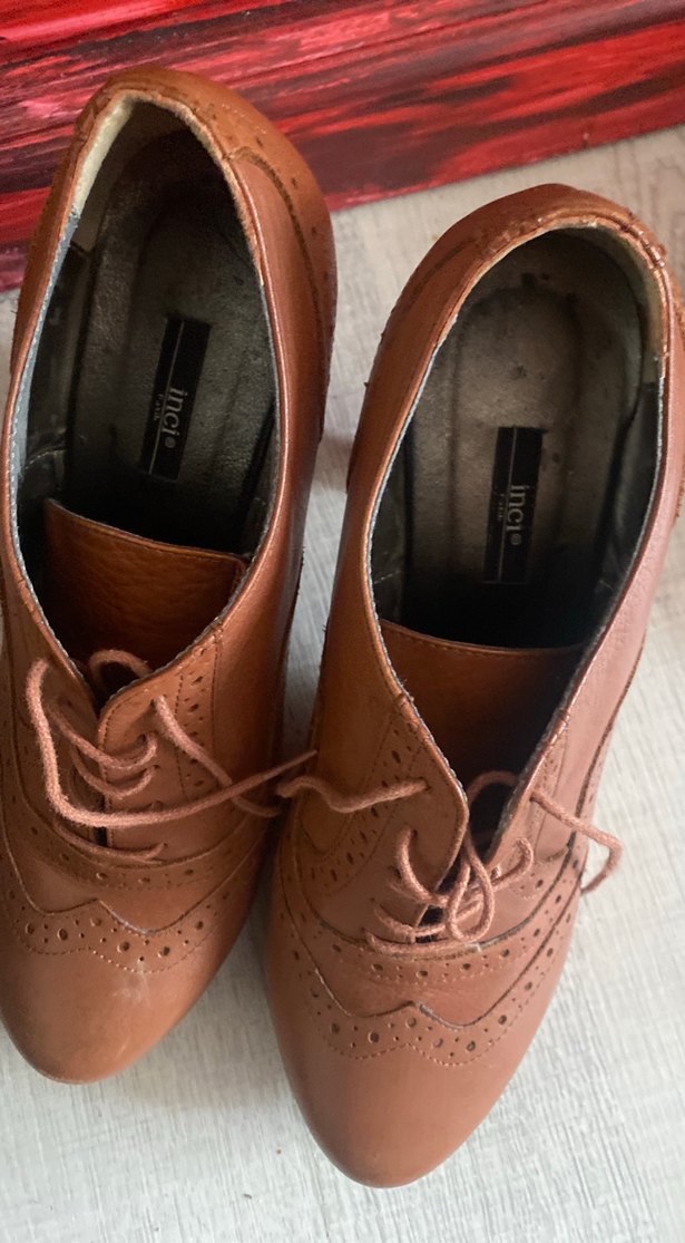 Bej renkte, parlak yüzeyli deri kadın ayakkabıları dolgu topuklu ve bağcıklıdır. Vintage normcore tarzıyla ofis kullanımına uygundur.