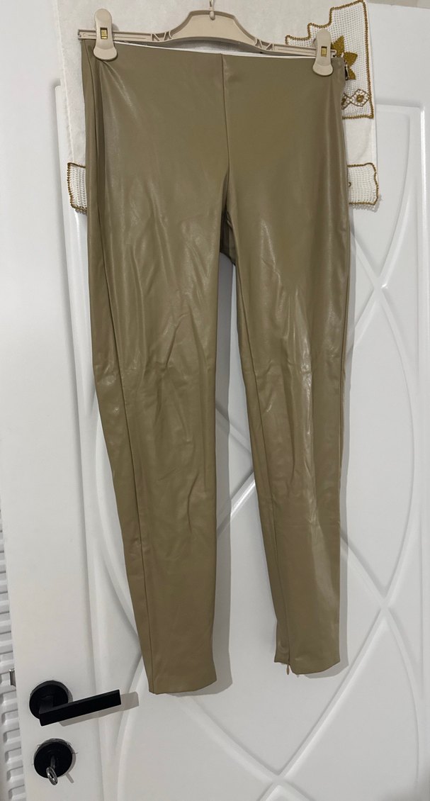 Fermuarlı detaylara sahip, parlak bej deri kumaştan, midi boy, dar kesim kadın pantolon. Günlük kullanıma uygun, Paris sokak stili esintili.