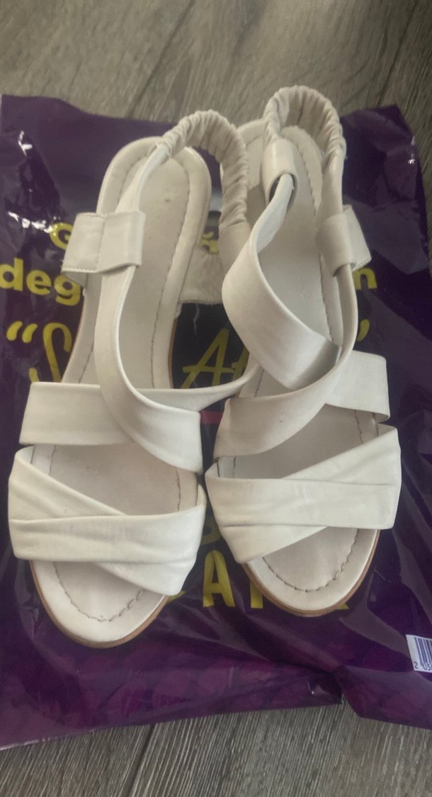 Arkası lastikli, deri beyaz dolgu topuklu, yumuşacık deri kadın sandalet. Düğün ve sokak stili için uygun, desen içermeyen hafif renkte.