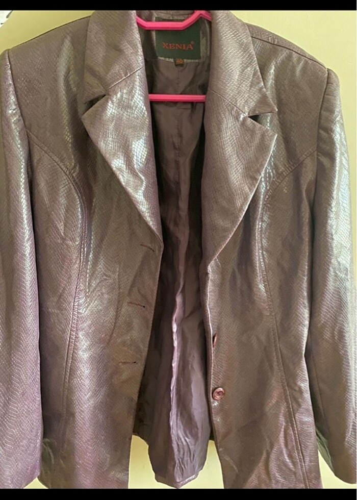 Xenia marka. Koyu Mürdüm moru renginde. Yılan desenli yumuşacık bir ceket. Defosuz sapasağlam. 38-40 beden uyumludur.