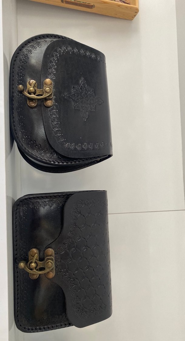İşlemeli desenlere ve tokalı kapanışa sahip siyah çocuk cüzdanı, biker tarzında.