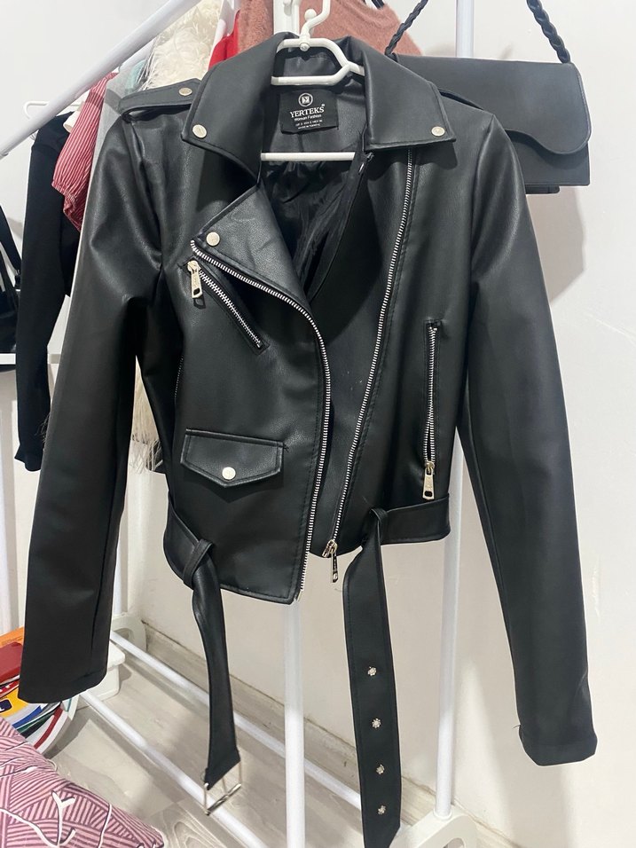 Siyah deri biker ceket, kemerli ve dar kesimdir. Notlu yakası ve askılı kolları vardır. Günlük kullanım ve sokak stiline uygundur. S beden Sırtında iz vardır onun dışında bir defosu yoktur