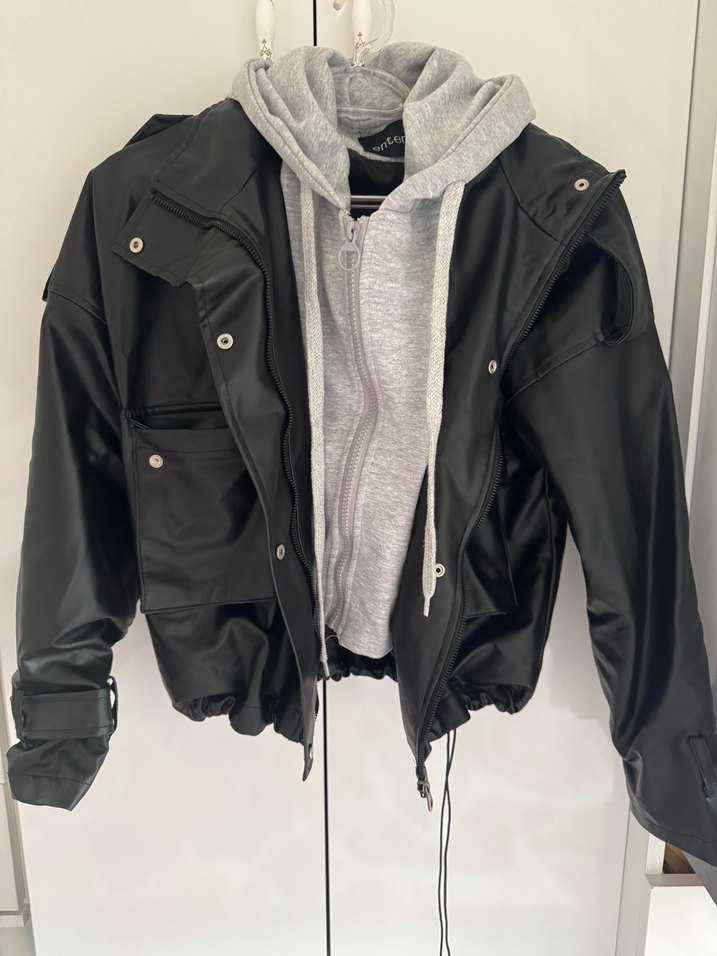 Gri hırkalı siyah deri ceket alttan ayarlanabilir
