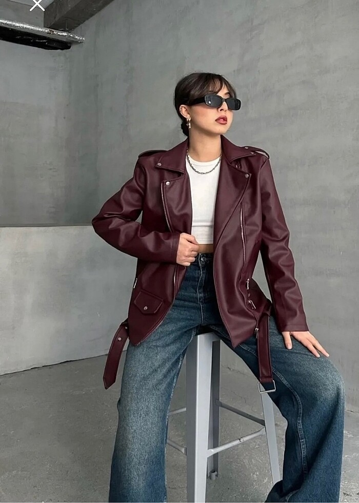 Uzun deri ceket oversize kalıp M beden mürdüm /bordo arası bir renk sıfır etiketli ürün (marka temsili)