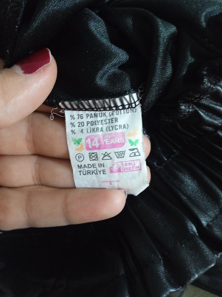 Deri Çocuk Pantolon yepyenidir. %76 pamuk, %20 polyester, %4 likra kumaştan üretilmiştir. 14 yaş için uygundur.